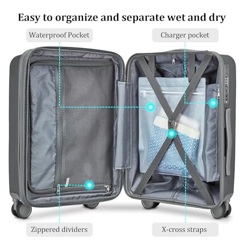 【Expandable Capacity】This 20 inch luggage features an expandable zipper that adds up to 20% more space to your carry-on luggage. It is also organized internally with YKK zippered dividers and X-cross straps, and is equipped with a waterproof bag for effective wet/dry separation.