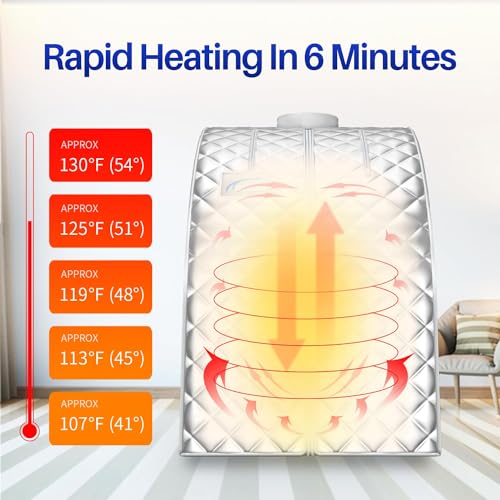 【Fast Heating in 6 Min】The steam pot has a capacity of 2L in the saunas for home, and It can be used for 60minutes after being filled up with water. 360 °omni-directional steam nozzles filled the whole steam tent in just 6 minutes.In addition, it has 9 gear settings, and the maximum temperature can reach 130 degrees Fahrenheit.