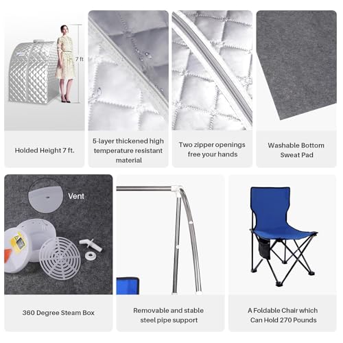 【Easy to Install and Durable Chair】Detachable frame permits you to disassemble for easy storage and the stainless steel structure is not easily deformed, guaranteeing a long service life. The sauna tent is highly sealed, with sweat-absorbing mats (which will also be machine washable), an ultra-comfortable chair and a remote keep watch over. A person who can bear a weight of 270lbs or less and a height of 75inches or less.
