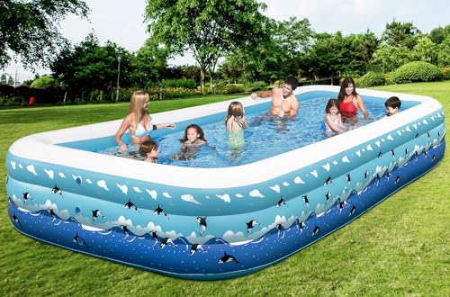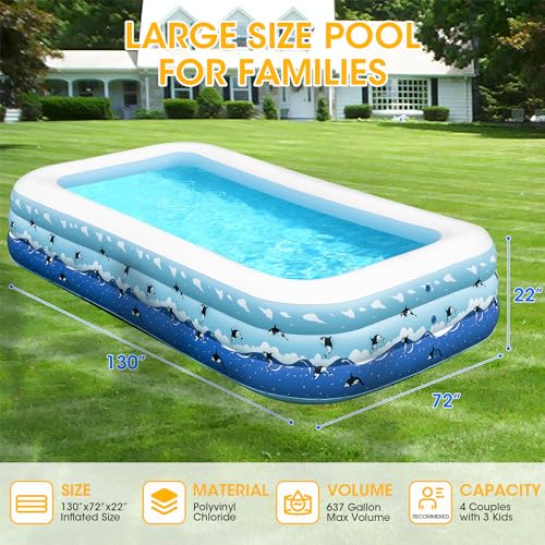 🐳[BIG OUTDOOR BLOW UP POOL]–Inflatable Pool dimensions: 130 * 72 * 22″. This swimming pool has a capacity of 637 gallons and can accommodate up to 4 adults and 3 children, which is 30% larger than a traditional inflatable pool. you can spend happy bonding pool time with your family.