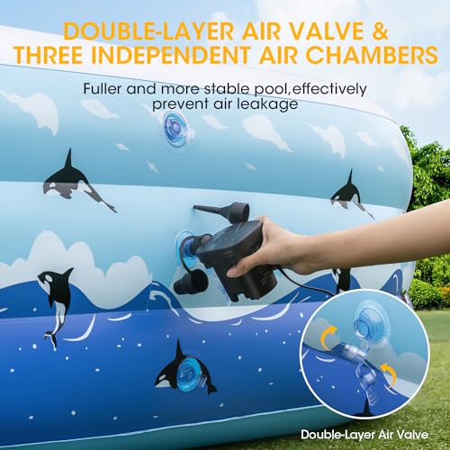 🐳[DOUBLE AIR VALVES FOR LEAK PREVENTION]– The latest model of our upgraded blow up pools for adults features double air valves for enhanced leak prevention. When inflating, first use the large inflatable port followed by the small one to fill the family pool more fully without worrying about air leakage when removing the inflator pump. During use, the double air valve makes the plugging port more stable, eliminating concerns about leaks.