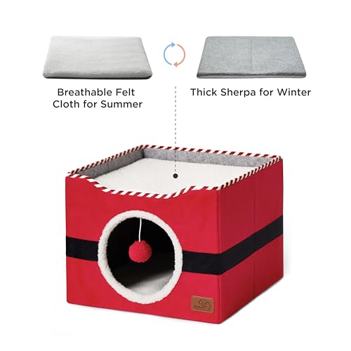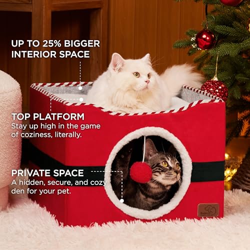 Bedsure Christmas Cat Beds for Indoor Cats – Large Cat Cave for Pet, Cat House with Fluffy Ball Hanging, Foldable Santa Cat Hideaway,16.5×16.5×13 inches, Christmas Red