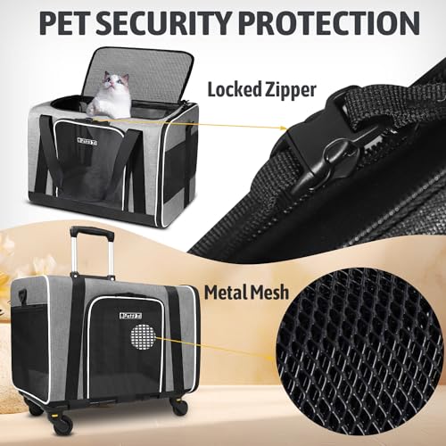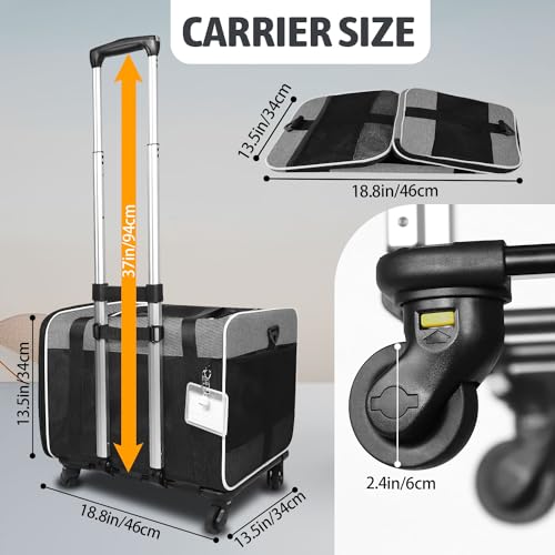 Cat Carrier with Wheels Rolling Pet Carrier 18.5×13.5×13.5inch for Small Medium Dog and Cat Soft Sided Carrier Foldable with Wheels Under 20lbs for Pets to Hospital Traveling (Grey)