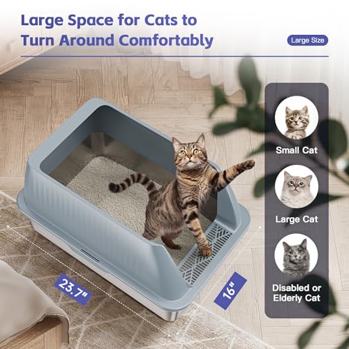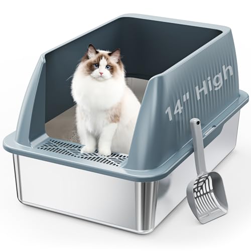 Hobya 14″ Stainless Steel Litter Box for Cats, XL Metal Litter Box for Large Cat, Extra Large Kitty Litter Box with High Sides for High Peeing Cat, Easy to Clean, Non-Sticky, Including Scoop
