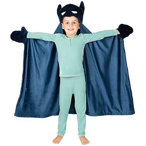 BATMAN DESIGN: Bad guys beware—your little Caped Crusader is in a position for action with this Batman hooded throw. The iconic Warner Bros. superhero brings his action-packed style to naptime or playtime with this super comfy “Be The Knight Crusader” throw in a Gotham-worthy black color scheme.