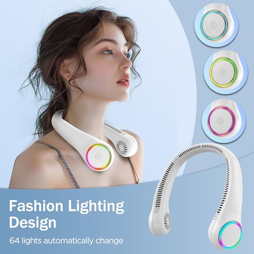 Neck fan, Portable Fan with 5-17H Lifespan, 4000mAh Personal Fan with 3 Adjustable Speeds and 64 Cool Lights, Nice Rechargeable Fan, Hands-Free Bladeless Personal Fan for Summer (White)