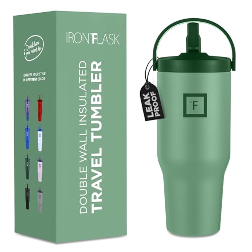 IRON °FLASK Sidekick Insulated Water Tumbler with Straw & Foldable Handle – Stainless Steel Leak-Proof Bottle, Non-Slip Base & Fits Cup Holders for Hot, Cold Drinks – Travel Mug – 30 Oz, Sage Grove