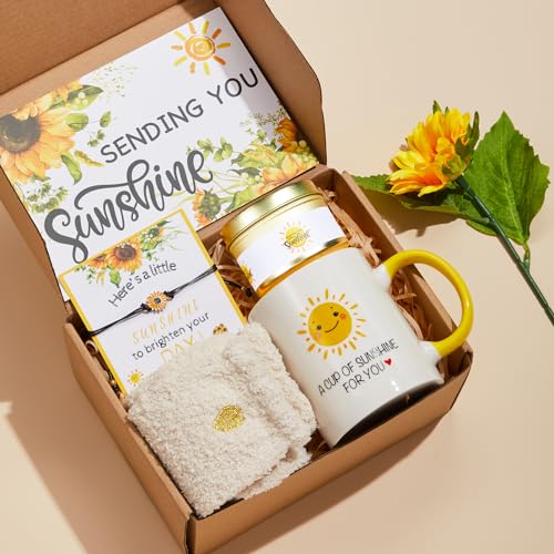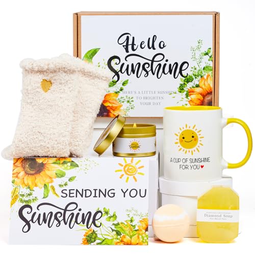 Get Well Soon Sunflower Gifts for Women: Brighten her day with an unforgettable unboxing experience that features a “Hello Sunshine” care package, perfect for mom, wife, girlfriend, sister, best friend, or any woman you care about. This sunflower gift box set includes coffee cup,sunflower bracelet, fuzzy socks, scented candles, artificial sunflowers, and a “Sending You Sunshine” greeting card.