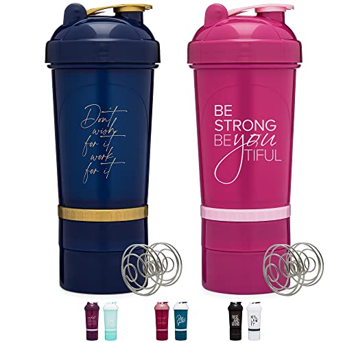 GOMOYO [2 Pack] 20-oz Shaker Bottle with Attachable Storage Compartments (Navy/Gold & Pink- 2 Pack) | 20 Ounce Protein Shaker Cup with Motivational Quotes | Attachable Container