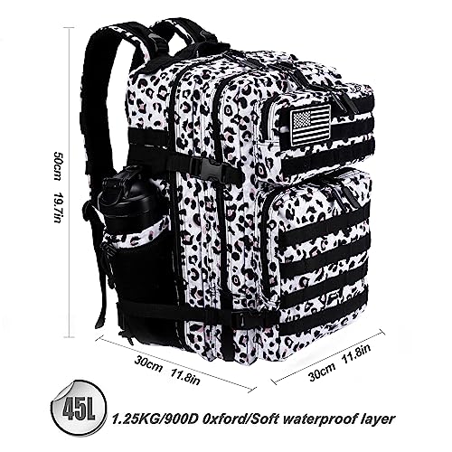1.Military Tactical backpack size approx: 12inch x 20inch x 12inch, Capacity: 45L; Military backpack is made of 900 oxford nylon fabric, durable and water-resistant. Suitable for fitness, go back and forth, hiking, camping and other outdoor activities.
