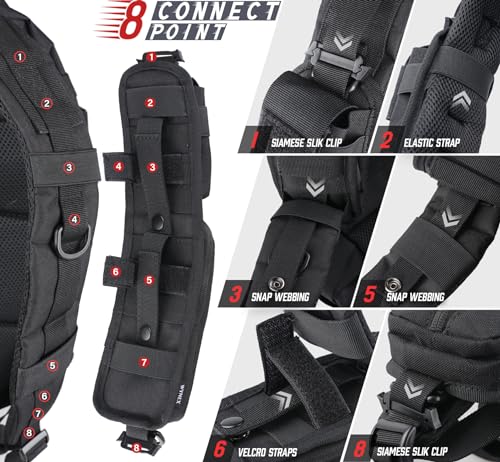 3 WAYS TO FIX ON: Molle Backpack Attachment can also be easily attached to any tactical MOLLE compatible gear by 3 ways. Including 2 * Molle straps and 2 * Hook-N-Loop straps to keep in place sturdy at the vertical/horizontal position. Strapping through the shoulder strap by the elastics, and firmly clipping the webbing with 2-way Z-Buckles. Wider adaptability for most backpacks.