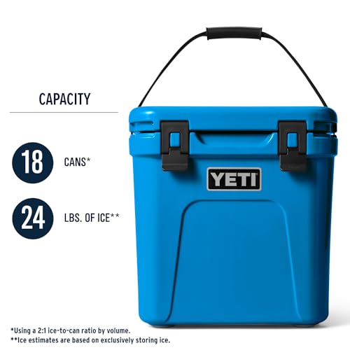 The Roadie 24 holds 18 cans with a 2:1 ice-to-can ratio or 24 lbs of just ice. It measures 16 1/2” L × 14 1/2”W × 17 1/2” H