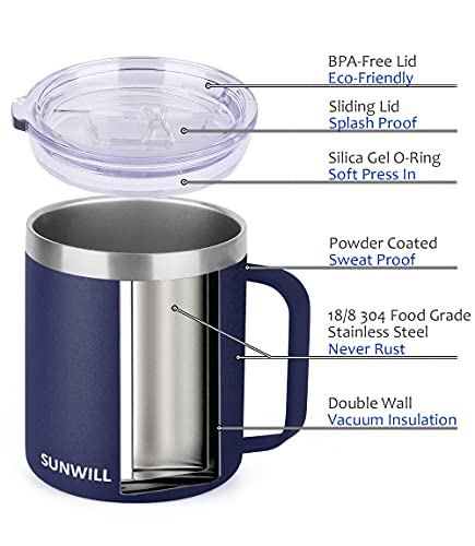Insulated Coffee Mug: SUNWILL coffee mug is with double wall vacuum insulation technology, keeping your favorite beverages hot for 3+ hours and cold for 9+ hours. Sweat proof, no condensation, burn free.