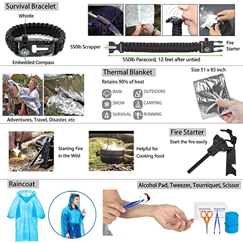 Exclusive 200PCS Survival Kit – Uniquely customized by U.S military veterans, our survival kit includes emergency survival gears, medical supplies, fishing tools, and a Molle EMT pouch to suit your whole needs. The all in one survival kit includes a tactical f*lding knife, wire saw, pen, fire starter, compass, emergency blanket, f*lding pliers, tactical defense whistle, saber card, bottle clip, carabiner, etc. The length of bl*de in the paracord bracelets is 0.2 inch