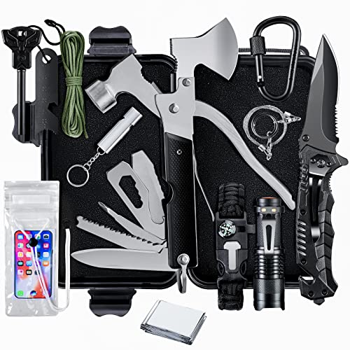 【13 in 1 Survival Gear and Equipment】 Survival kit incorporates the practical tools you want when an emergency occurs. 14 in 1 survival axe, 8 in 1 survival knife, 6 in 1 survival rope bracelet, fire starter, waterproof case, flashlight, wire saw, metal Lanyard, umbrella rope, silver whistle, waterproof bag, first aid blanket, waterproof cell phone bag, and so forth. Suitable for men, women, parents. It is a cool gadget for girls and boys.