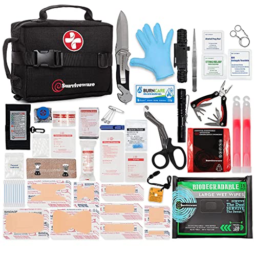 Specification: Surviveware Survival First Aid Kit – Emergency Preparedness at Home, Car, Office, Hiking, Camping & Outdoors Activities – 180 pcs Medical Supplies w/Removable MOLLE System & Labeled Compartments