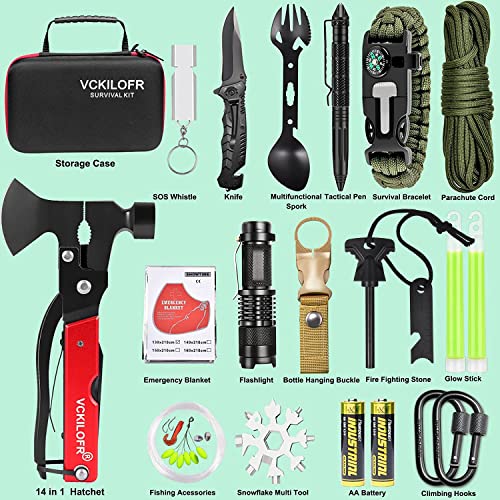 Necessary Equipment You Must have: Contains 14 in 1 Hatchet, Tactical Pen, 18 in 1 Snowflake Tool, Water Bottle Clip, Emergency Blanket, Flint Stone Scraper, Flashlight, 2 pcs Glow Sticks, Multi-use Spoon Fork, Whistle, Parachute Cord, Survival Bracelet, Fishing accessories, 2pcs AA Battery, and Storage Case.