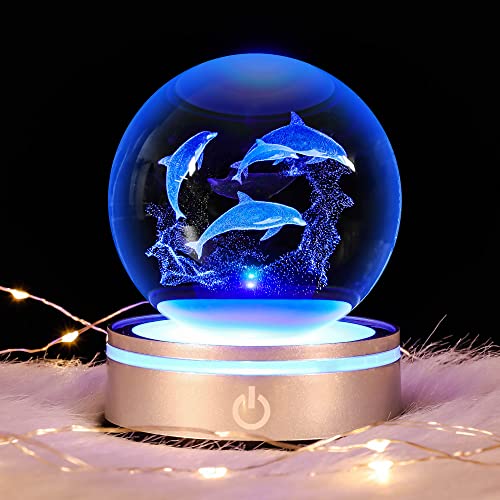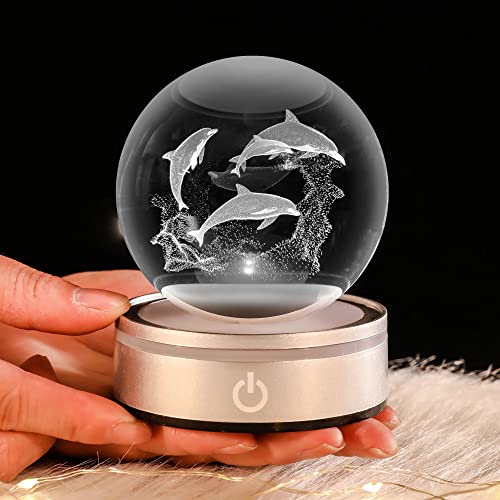 Dolphin Gift 3D Crystal Ball with LED Light Base Unique Figurine Lamps Laser Engraved Nightlight for Kids Gifts Dolphin Lovers Girlfriend Wife Mom Lovers Girls Boys Birthday Christmas
