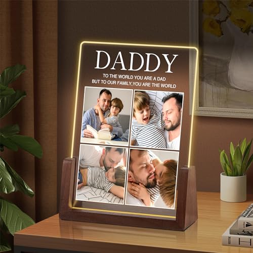 Custom Fathers Day Birthday Gifts for Dad from Wife Daughter Personalized Dad Gifts from Son Kids Customized Walnut Frame Acrylic Plaque Printed with Photos LED Night Light Gifts for Papa Daddy