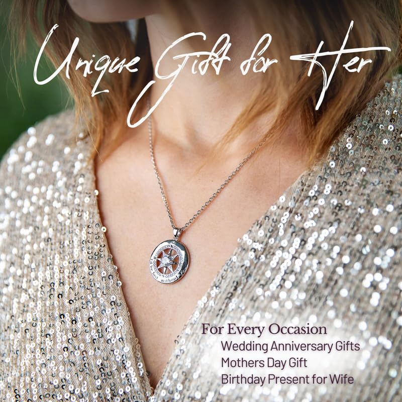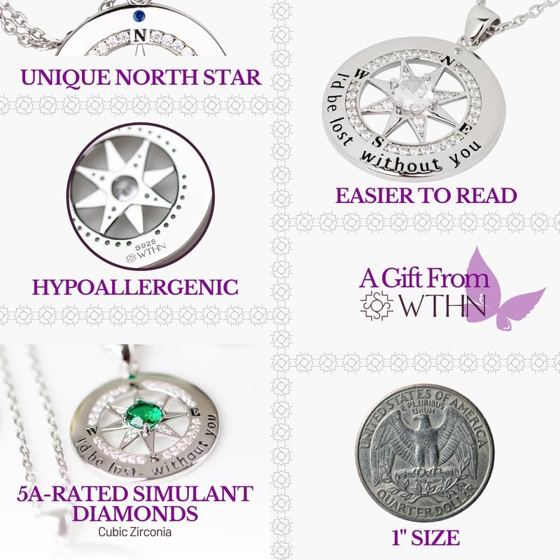 Unique S925 Sterling Silver Jewelry Birthstone Necklace Anniversary or Mothers Day Gift For Wife Girlfriend Her I’d Be Lost Without You Pendant Compass Necklace For Women
