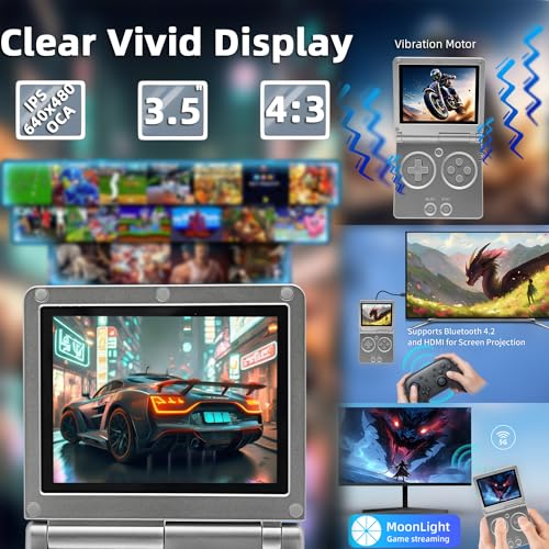 [RG35XXSP Retro Handheld Game Console]: Dive into a world of vivid colors and clarity with the 3.5-inch IPS full-viewing angle screen. Its 640×480 resolution brings your favorite games to life, capturing each minute detail.