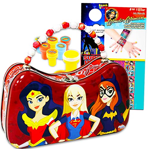 This DC bundle features bonus Wonder Woman bracelet stickers, a superhero door hanger, and a superhero stampers. Best for children sleepovers and party supplies.