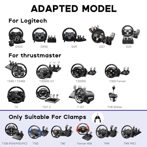 【Compatible with Most Racing Wheels】The RACGTING racing simulator cockpit is compatible with most racing wheels, including Logitech models like G29, G920, G923, G27, and G25, as well as Thrustmaster models like T248, T248X, T300RS GT, T150, T80, TX, T-GT, TS-PC, and TS-XW. It can be used with PS5, PS4, Xbox One, and PC platforms. (Note: Wheel, shifter, and pedals are NOT included.)