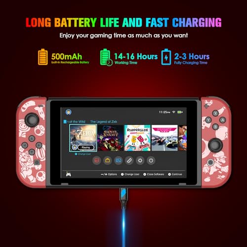 【Extra Long Gaming Time】Our replacement controller has a built-in 500 mAh rechargeable lithium battery, which will fully charge the controller for nintendo switch in 2-3 hours, with a range of as much as 10-15 hours, revel in long uninterrupted gaming